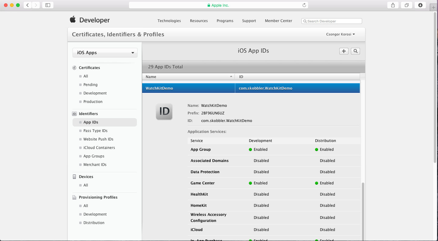 Înainte de a trece la următorul capitol, mai este un lucru de făcut - comunicarea între aplicația iOS și extensia WatchKit, care este posibilă doar printr-un fișier comun. În primul rând, deschideți secțiunea Identifiers de pe https://developer.apple.com Selectați ID-ul aplicației și activați opțiunea App Group. După configurare, regenerați profilul care folosește acest ID. Notă: vă rugam să folosiți app id-ul propriu pentru activarea App Groups.