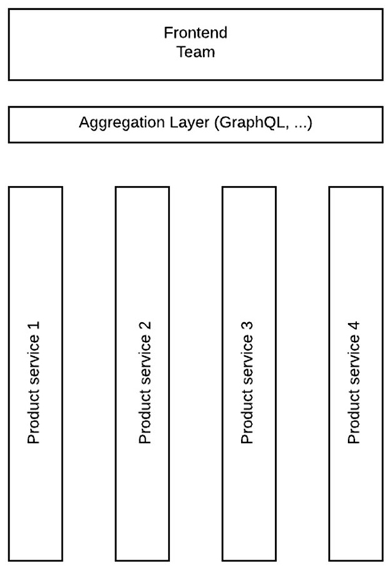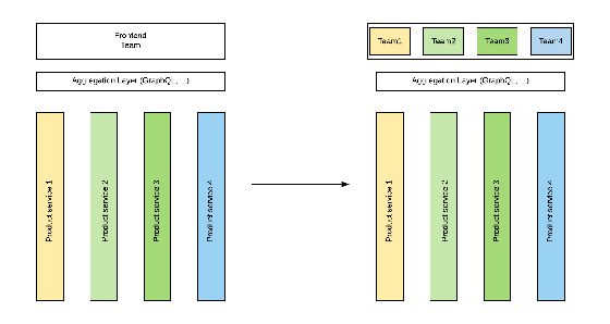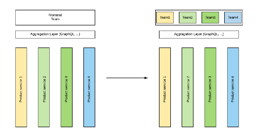 Așadar, avem un frontend scris ca un monolit, dezvoltat de o echipă mare de programatori. Scopul este să dăm controlul înapoi echipei de development a fiecărui microserviciu, în așa fel încât, să poată să își aleagă tehnologia cea mai bună pentru a rezolva o anumită cerință funcțională, chiar și la nivel de frontend.