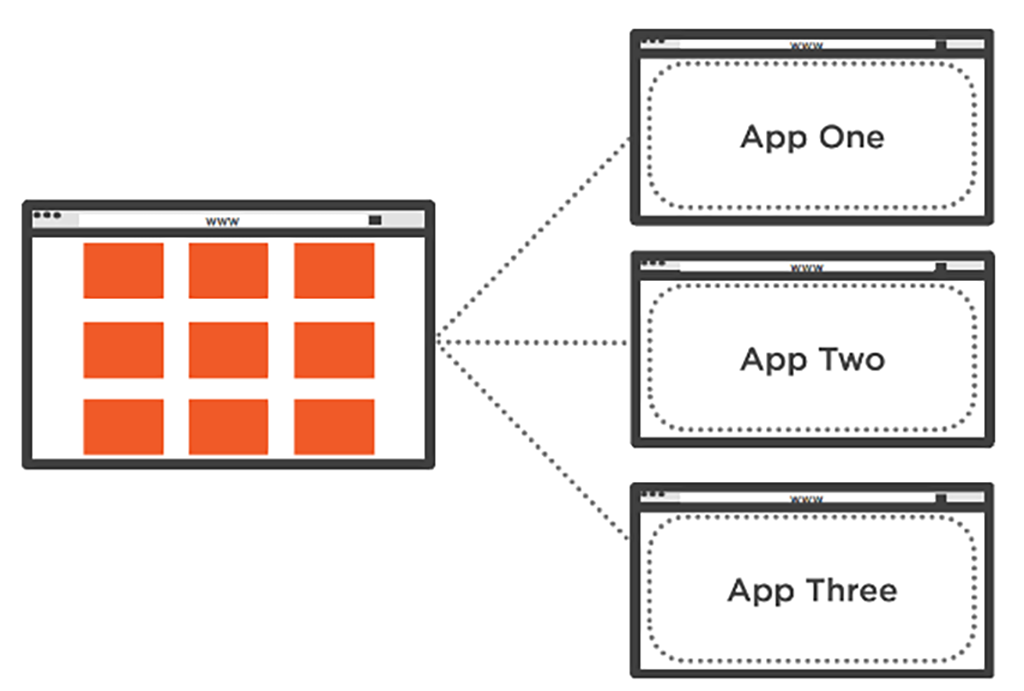 Prin acest concept, utilizatorul va vedea o listă de aplicații care pot să fie afișate ca SPA. Practic, se va afișa o listă de URL-uri ce te trimite la o colecție de SPA-uri, fiecare SPA oferind acces la o singură capabilitate, în izolare. Interacțiunea între aceste SPA-uri se va face prin extinderea query stringului pasat ca URL, sau prin interacțiune de date la nivel de microservicii.