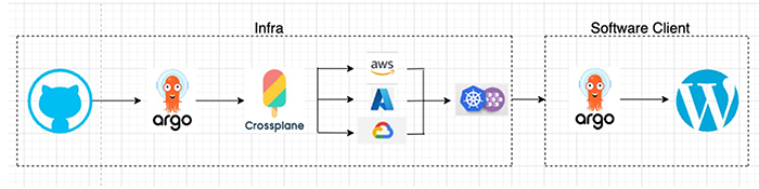 Prin intermediul GitHub Actions și Terraform vom automatiza crearea unei instanțe de ArgoCD, ce va instala cu ușurință Crossplane. De aici, putem alege după preferința clientului orice furnizor public de servicii Cloud în care să avem un cluster de tip Kubernetes.