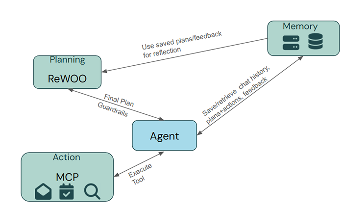 Once a final plan is formed, the Action module carries out the steps using available tools. This module is usually implemented either by direct function calling or exposing tool functions through the Model Context Protocol (MCP)—a standardized interface that governs how LLMs interact with external services. In this application, the implemented tools include a web search retriever for real-time information retrieval and specific Google API integrations for email (Gmail) and calendar (Google Calendar) operations.