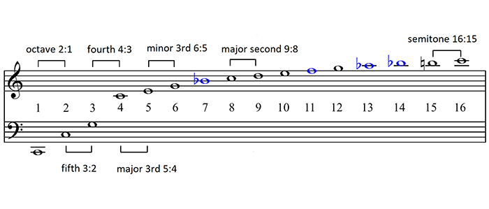 Seria armonică este setul de frecvențe care sunt multipli întregi ai unei frecvențe fundamentale: f, 2f, 3f, 4f, 5f etc., generate de modurile naturale de vibrație ale unei corzi fixate la capete. Fiecare armonică corespunde unui tipar de vibrație cu un număr crescător de noduri (puncte fixe) distribuite uniform: un segment pentru fundamentală, două pentru armonica a doua, trei pentru a treia ș.a.m.d. Raporturile dintre fiecare armonică și cea precedentă (2:1, 3:2, 4:3, 5:4), definesc intervale muzicale specifice, precum octava (2:1), cvinta perfectă (3:2), cvarta perfectă (4:3) și terța mare (5:4).