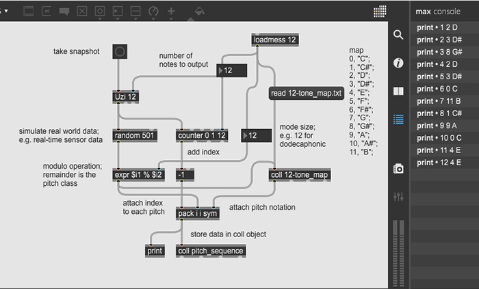 Patchul folosește obiectul [uzi] pentru a produce 12 impulsuri succesive, care declanșează obiectul [random]. Logica de programare subiacentă utilizează resturi modulo, apoi indexează și mapează cele 12 numere generate pe înălțimi, făcându-le mai ușor de citit. Secvența obținută este apoi stocată într-un obiect [coll], ceea ce o face perfect compatibilă cu [zl].