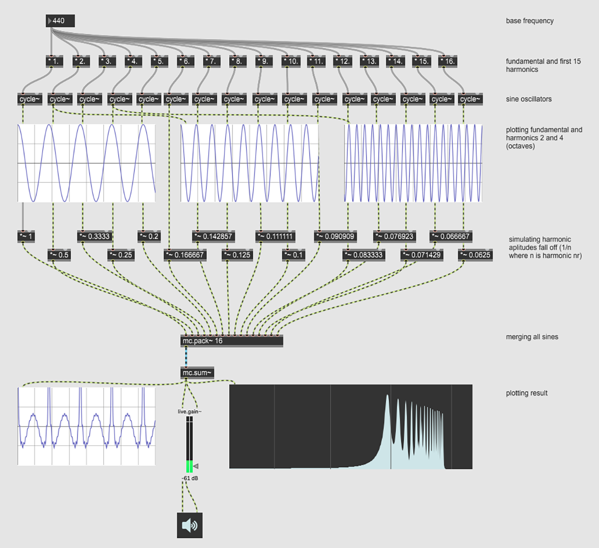 În Max/MSP putem recrea acest fenomen folosind [cycle\~] și puțină logică de programare. Astfel înțelegem mai bine fenomenul natural și îl putem reconstrui invers pentru a crea sunete noi. De exemplu, modificarea intensității fiecărei armonice schimbă timbrul unui sintetizator, la fel cum construcția fizică a unui instrument acustic amplifică sau estompează anumite armonice, oferindu-i spectrul său particular. Această preocupare a atras compozitorii încă din secolul XX, mai întâi prin explorarea unor instrumente exotice, apoi prin inventarea unor instrumente complet noi.