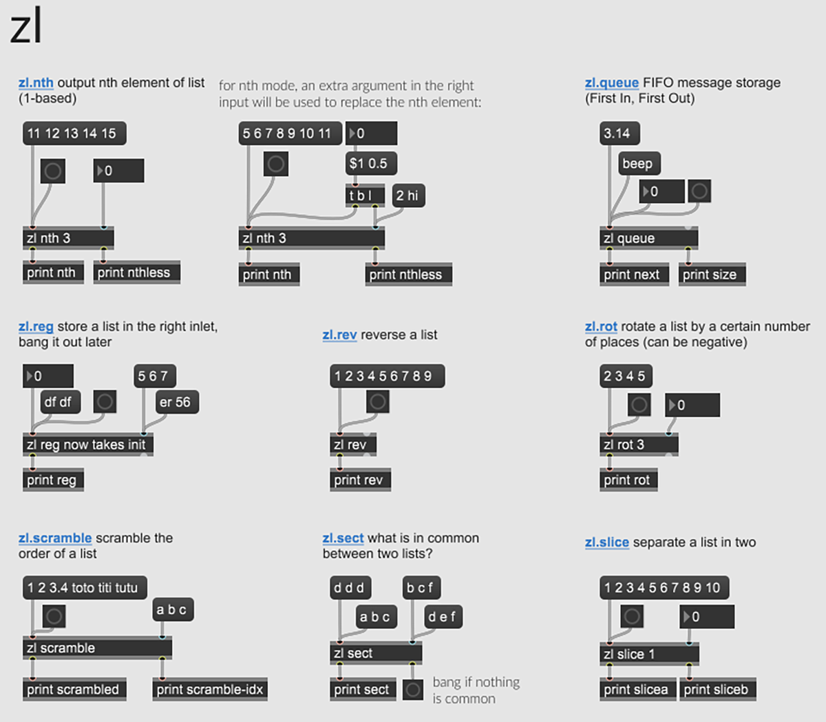 Obiectul [zl] este folosit pentru procesarea listelor și permite operații identice cu transformările din arsenalul unui compozitor. Transformări precum inversiunea, retrogradul sau transpoziția sunt echivalentele algebrei liniare pentru invert, reverse și shift. Deși acest subiect ar merita un capitol separat, merită menționat că astfel de transformări (și multe altele) sunt folosite constant de către compozitori pentru a obține material nou care păstrează totuși un grad de familiaritate pentru ascultător. Aceasta este o practică prevalentă, dar nu limitată, la muzica barocă și la serialism.