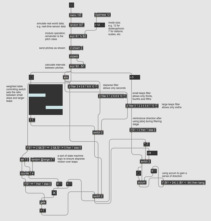Revenind la programarea în Max/MSP, dacă intervalele sunt reprezentate prin numere de la 0 la 11 și lucrăm cu o secvență numerică, putem crea o logică de tip "gate" care forțează un anumit număr de pași treptați înainte de a permite apariția unui salt.