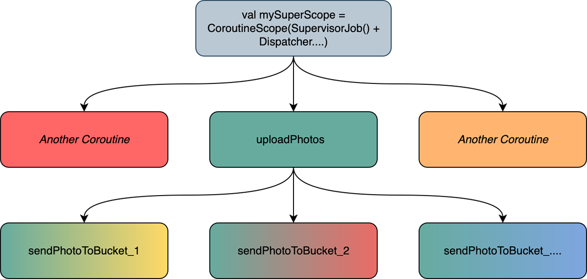 Folosirea mySuperScope și în uploadPhotos. Astfel, coroutina noastră moștenește un SupervisorJob, iar eșecul unei coroutine copil nu va anula celelalte.