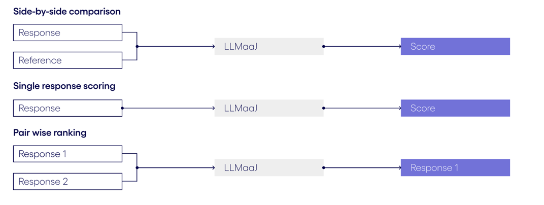 Comparare side-by-side: Un LLM compară un răspuns generat cu unul de referință și acordă un scor.