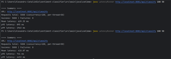 Pentru a surprinde comportamentul fiecărui framework sub trafic real, am scris un mic instrument de măsurători în Java care profită din nou de existența Virtual Threads. Scriptul îmi permite să specific atât numărul de workeri concurenți, cât și numărul de requesturi pe care fiecare worker trebuie să le trimită. Fiecare thread trimite în buclă apeluri HTTP POST către endpointul /api/classify, măsurând timpul pentru fiecare request în parte. După finalizarea tuturor requesturilor, scriptul agregă rezultatele și calculează statistici-cheie: latența medie, precum și percentilele p95 și p99[^6]. Acest set-up oferă o perspectivă mai realistă asupra timpilor de răspuns la scară: nu doar cazul mediu, ci și cât de des și cât de sever apar vârfuri de latență pe măsură ce crește concurența. Rulând scriptul atât pe aplicația Quarkus, cât și a Spring Boot cu parametri identici, am putut obține o comparație corectă a reactivității sub sarcină. Rezultatele pot fi văzute mai jos: