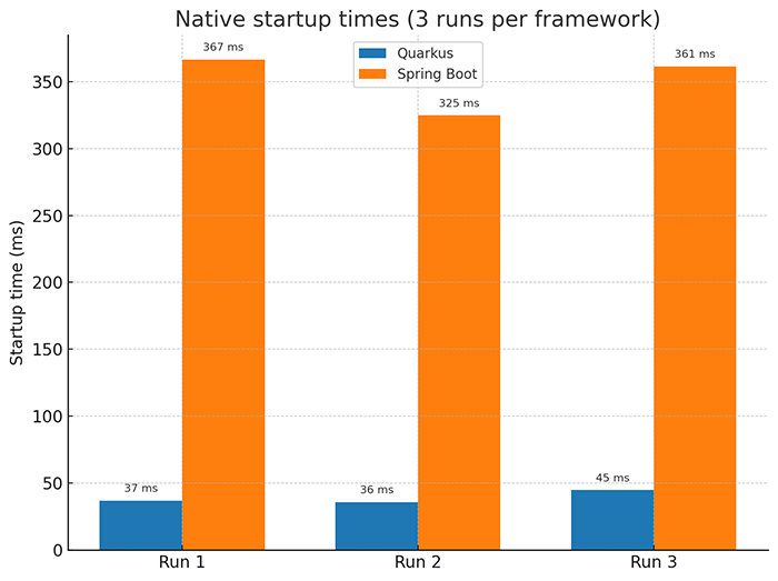Pornind imaginile native de mai multe ori, diferența a crescut până la aproape de 10x (Quarkus fiind de zece ori mai rapid la startup). Am decis să rulez trei teste diferite ca să văd dacă diferența se menține. După cum se vede în diagramă, diferența este consistentă și rămâne aproape 10x în favoarea Quarkus la fiecare dintre cele trei rulări.