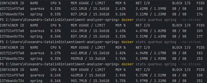Pentru evaluare, containerele Quarkus și Spring Boot au fost supuse unui test de încărcare controlat, în timp ce consumul de memorie a fost monitorizat. Procedura a fost următoarea: folosind Virtual Threads, după ce aplicațiile au fost pornite în Docker pe două porturi diferite (8081 și 8082), am generat un număr crescător de requesturi pentru fiecare aplicație și am monitorizat rezultatele. Am repetat execuția de mai multe ori pentru a observa o tendință, pornind de la 100 de cereri paralele și ajungând până la 400 de cereri paralele.