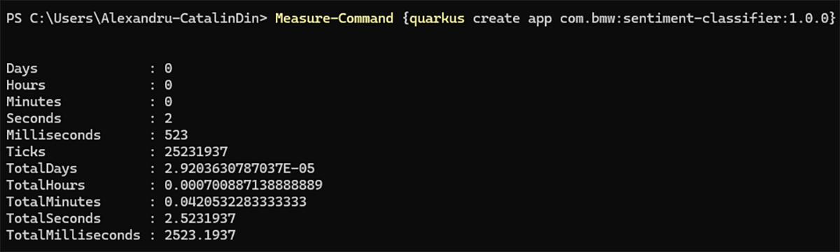 După cum se poate observa, timpul de execuție este similar (~2,3 secunde pentru Spring, ~2,5 secunde pentru Quarkus). Ceea ce este vizibil de la început este că sintaxa Spring CLI este mult mai stufoasă prin comparație cu Quarkus. Asta reflectă perspectiva generală a Quarkus, unde simplitatea este esențială.