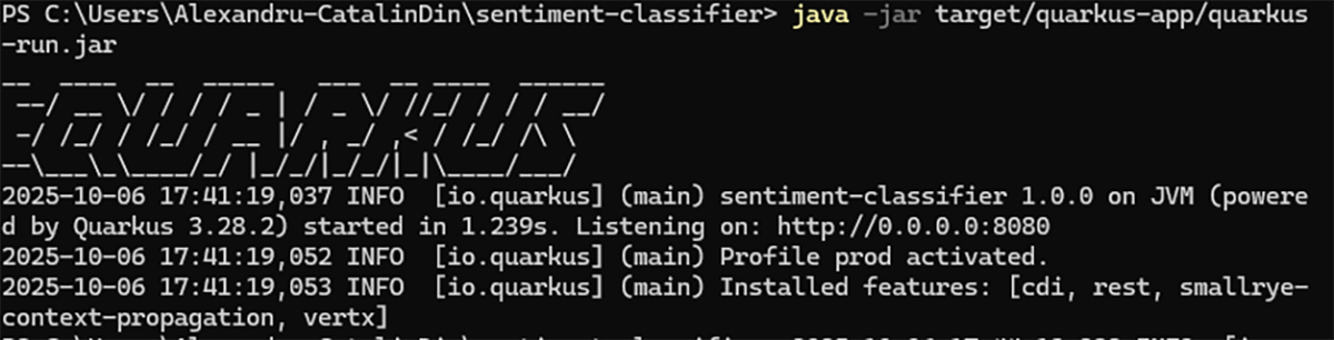 Payload: '{"inputs":"Alex absolutely loves Quarkus! It exceeded all his expectations."}'