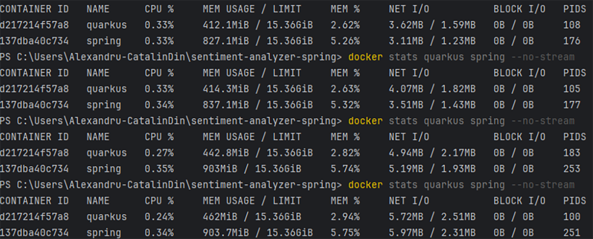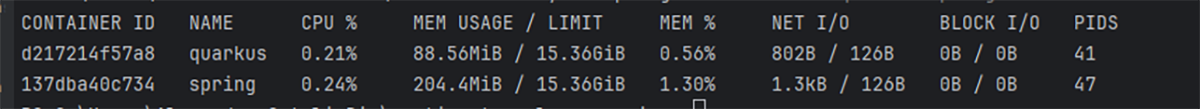 Așa cum era de așteptat, imaginea Quarkus tinde să fie mai "ușoară" datorită modului optimizat de packaging, în timp ce imaginile Spring Boot includ de obicei un set de dependențe mai voluminos. Deși diferența poate să nu pară dramatică într-un mediu local, în medii la scară mare, unde zeci sau sute de servicii sunt deployate, aceste diferențe se adună și se transformă în costuri operaționale palpabile.
