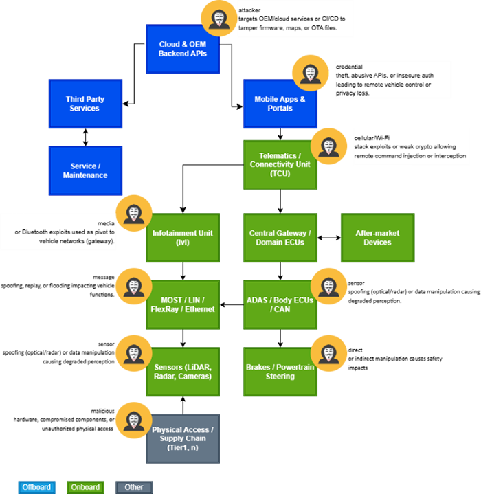 Odată cu apariția tehnologiilor noi și perturbatoare (emerging & disruptive technologies) și a tendințelor emergente, cum ar fi inteligența artificială și învățarea automată (machine learning), rețelele 5G și creșterea numărului de dispozitive IoT, din punct de vedere istoric, atacatorii sunt astăzi mai sofisticați ca niciodată. În timp ce fiecare nou pachet de tehnologii (technology stack) vine cu oportunități unice, acesta poate fi utilizat în ambele moduri: fie pentru a face bine, fie pentru a face rău. Primul motiv constă în valorificarea capacităților echipelor albastre, roșii și purpurii (Blue-, Red- & Purple Teams) pentru a utiliza aceste tehnologii noi în vederea menținerii și consolidării posturii de securitate a organizațiilor. Prin utilizarea frameworkurilor de securitate cibernetică de ultimă generație, cum ar fi MITRE ATT&CK, Automotive Threat Matrix (ATM) sau standardele acceptate de industrie, cum ar fi ISO/SAE21434. Pe de altă parte, cel de-al doilea motiv avantajează actorii malițioși. Exploatând tehnologii precum inteligența artificială, atacatorii pot efectua o gamă largă de activități din umbră, dintre care unele includ executarea de coduri malițioase prin implementarea de sarcini utile (payloads), impersonarea (de exemplu, Deep Fakes) și alte atacuri de tip inginerie socială. Cu ajutorul noilor tehnologii, acest tip de incidente poate fi creat și realizat cu ușurință. Pentru ca lucrurile să se înrăutățească încă și mai tare, atacatorii operează în interiorul deep și dark web în calitate de custozi pentru Ransomware-as-a-Service. RaaS este un model de afaceri de criminalitate informatică în care dezvoltatorii de ransomware comercializează și vând coduri malițioase sau malware altor hackeri, funcționând astfel similar unui model de franciză. Alți vectori de atac în domeniul embedded și auto includ intrarea fără cheie/furtul de pornire fără cheie (keyless go/keyless entry), în care atacatorii folosesc atacuri prin releu (relay) sau bruierea (jamming) semnalului pentru a debloca și porni o mașină. Atacurile cibernetice pot viza sistemele interne ale unui vehicul, cum ar fi porturile USB, WI-Fi sau magistrala CAN (Control Area Network), pentru a obține controlul asupra funcțiilor principale de siguranță ale acestuia, cum ar fi frânarea, direcția sau airbagul. Prin utilizarea unei abordări stratificate (defense-in-depth), atacatorii obțin un punct de sprijin inițial într-un sistem, trecând astfel la sisteme mai atrăgătoare prin efectuarea de mișcări laterale pentru a se deplasa de la un sistem la altul în vederea escaladării ilegale a privilegiilor.
