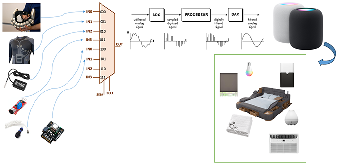 Dintre aplicațiile pe rol în prezent am menționa monitorizarea somnului. Prin utilizarea senzorilor purtabili și a logicii de control fuzzy se monitorizează și se "măsoară" calitatea somnului, indice îmbunătățit prin controlul mediului ambient. ( Vezi Figura 3).