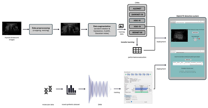 2. Oncologie: Sisteme CAD pentru detectarea cancerului colorectal și stratificarea riscului în cazul nodulilor tiroidieni, combinând datele imagistice (ultrasunete) cu date citologice și moleculare. (Vezi Figura 4.)