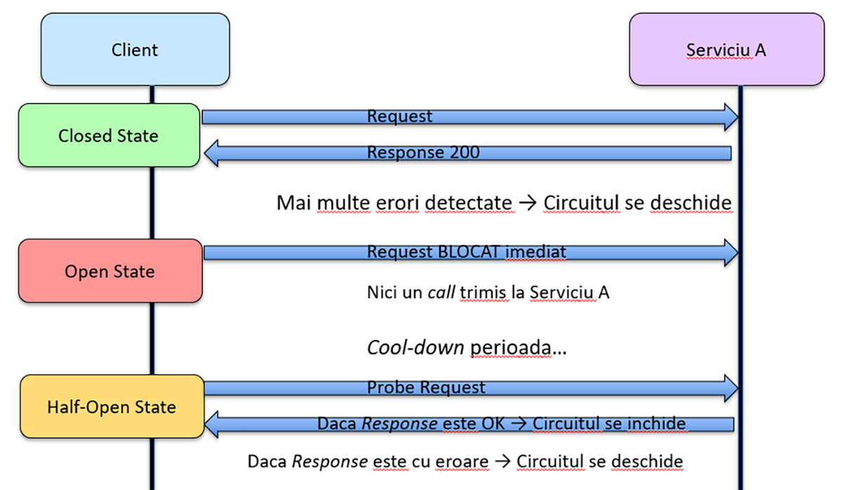 Modelul Circuit Breaker protejează sistemul de apeluri repetate către un serviciu care deja eșuează. În loc să tot încerci la nesfârșit și să se agraveze problema, circuit breakerul "se deschide" după un anumit număr de erori și blochează temporar apelurile către serviciul nesănătos. Acest lucru oferă timp serviciului defect să își revină și împiedică aplicația să irosească resurse pe apeluri care aproape sigur vor eșua.
