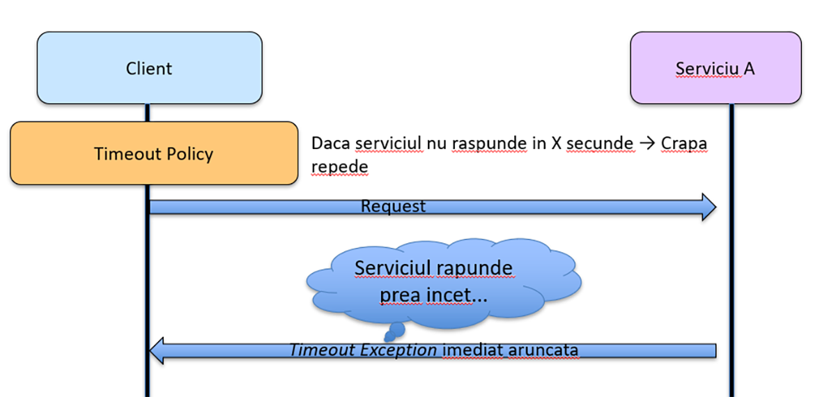 O politică de timeout protejează aplicația de situațiile în care se așteaptă prea mult după un răspuns. În sistemele distribuite, un serviciu lent poate fi la fel de dăunător ca unul care eșuează complet. Dacă aplicația așteaptă la nesfârșit, threadurile se blochează, cozile se umplu, iar întregul sistem devine brusc lent.